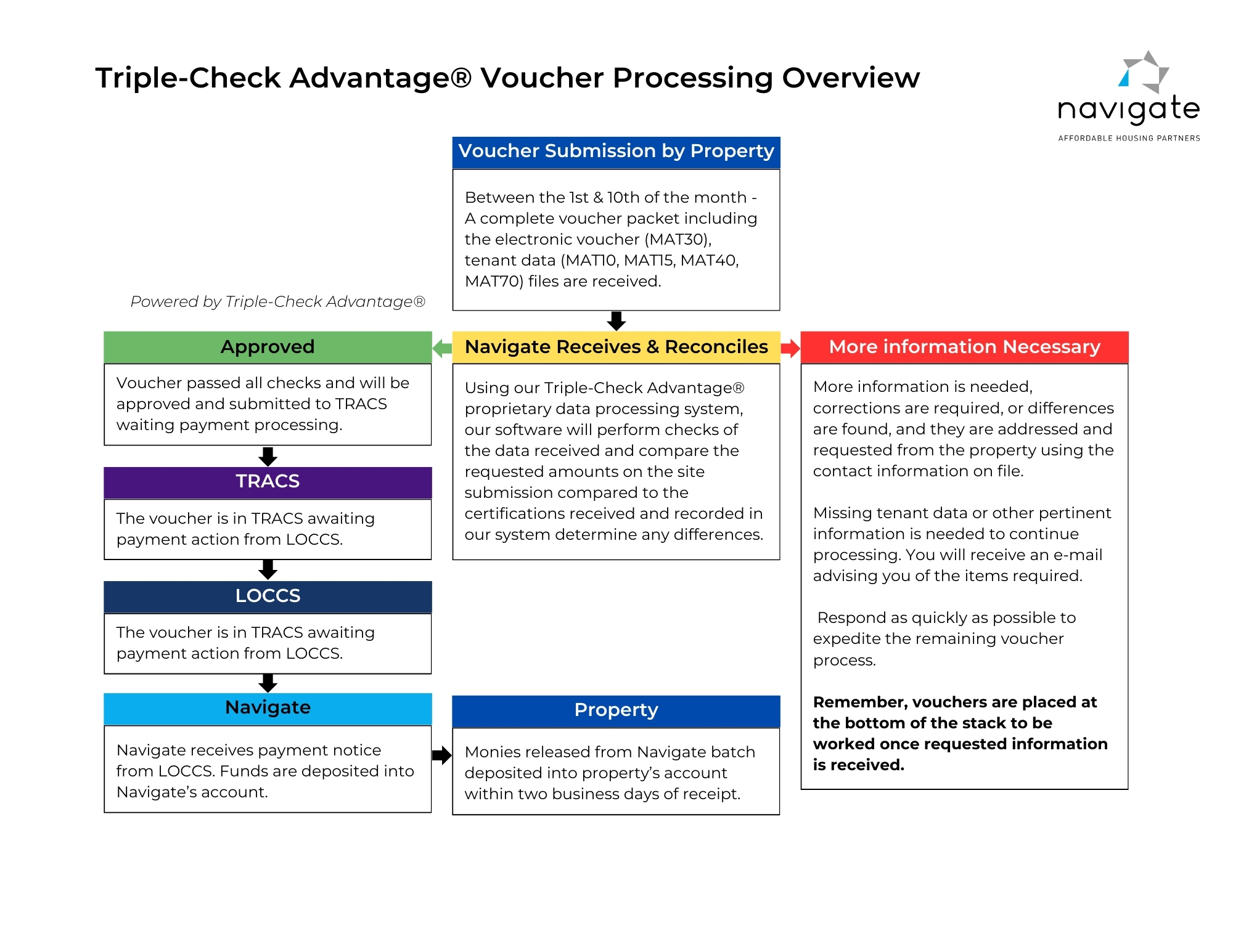 We strive to assist and educate our owners on industry matters building close working relationships in the process. Click here to view an overview of the processing cycle showing all actions taken throughout this process to ensure accurate, timely HAP payments. Our Triple-Check Advantage ensures the accuracy of our data processing.